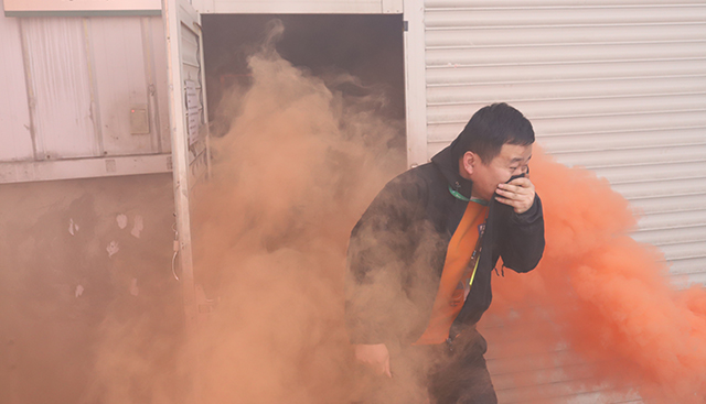 員工手捂口鼻低頭彎腰井然有序逃離火災(zāi)現(xiàn)場