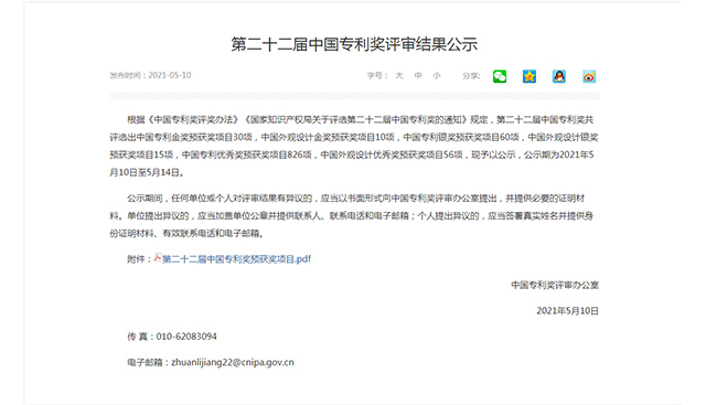 國家知識產權局發布的第二十二屆中國專利獎公示名單中,株洲市共取得1項銀獎,5項優秀獎。