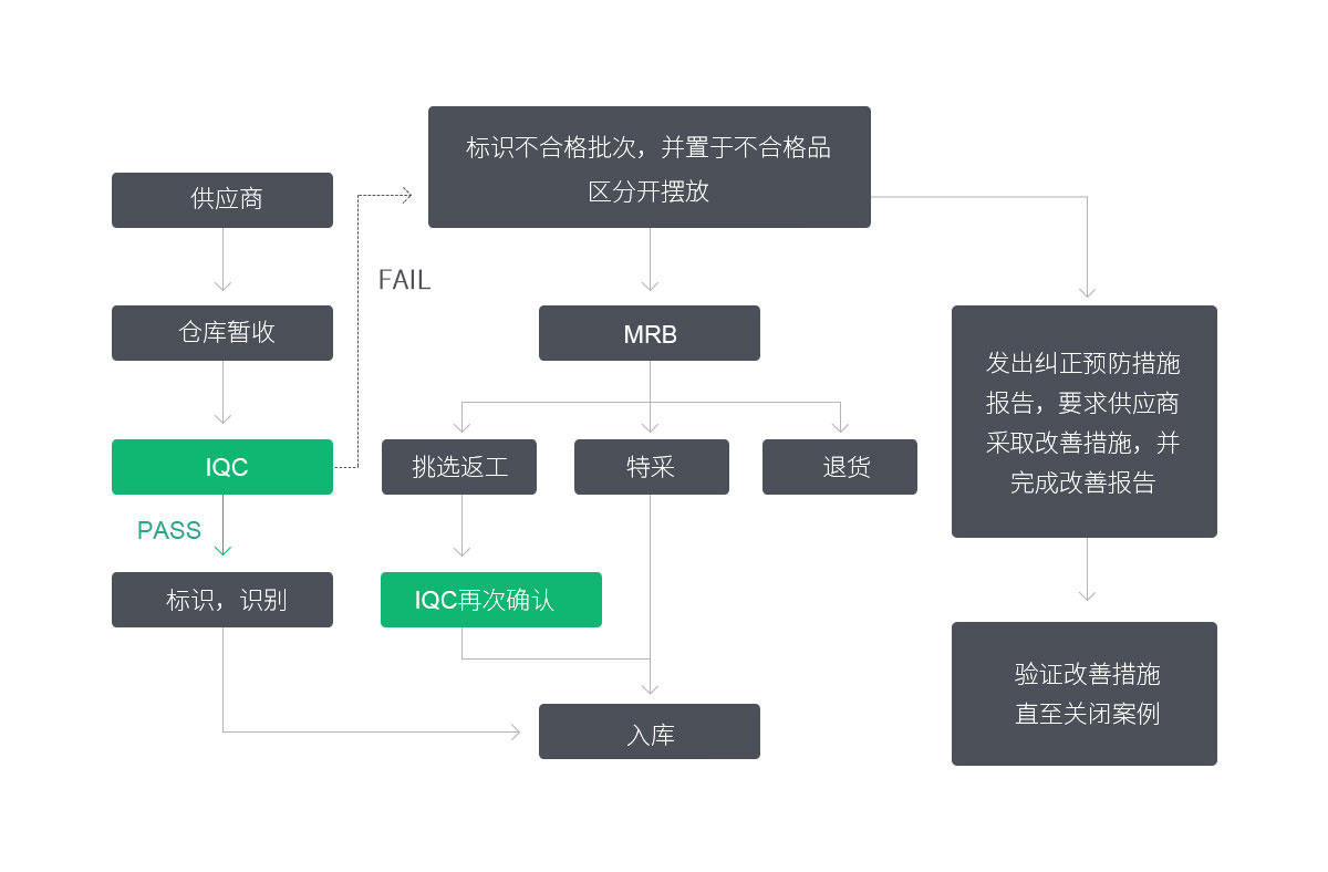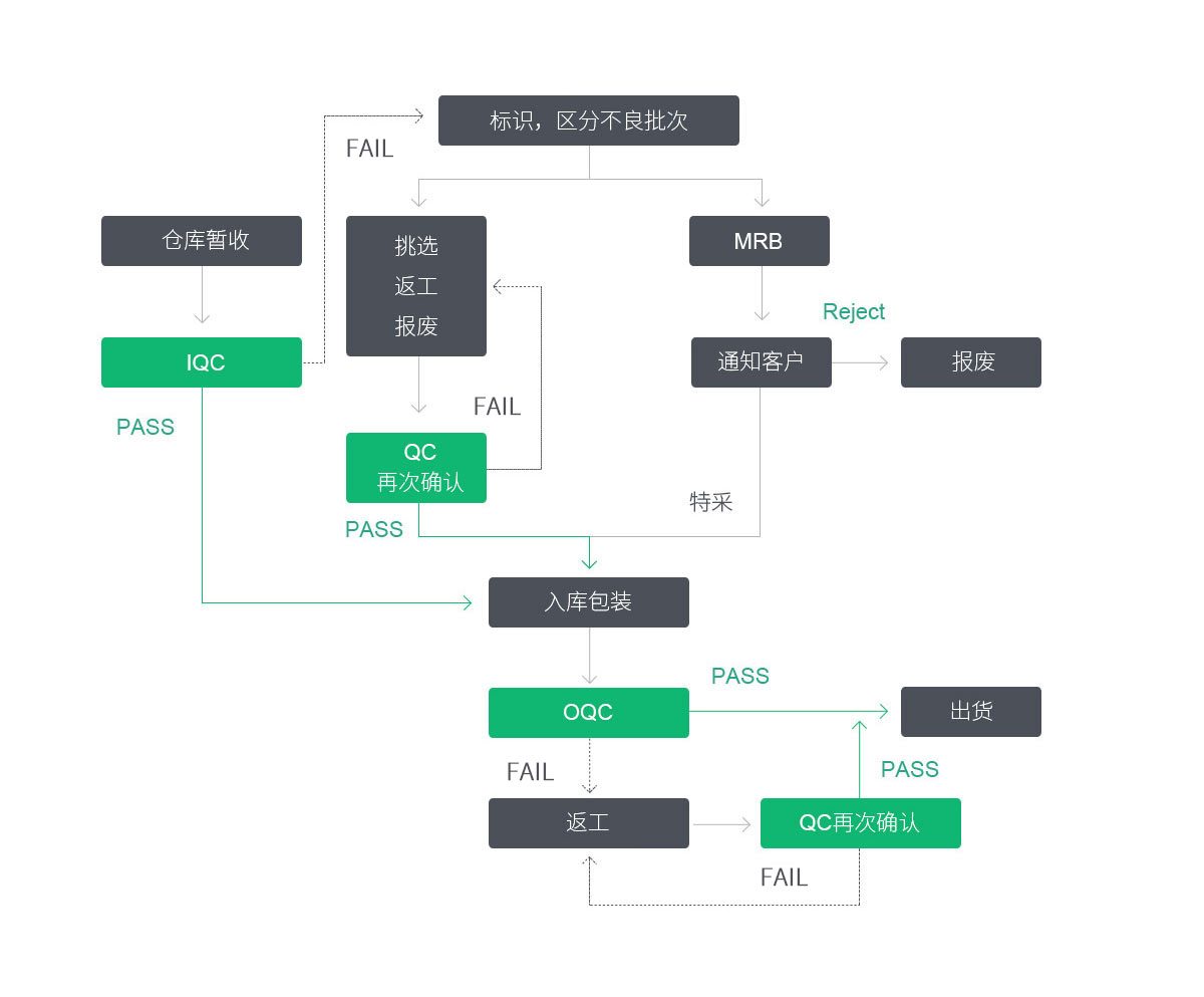 建立健全的質量管理制度,針對生產加工控制過程建立來料檢驗(IQC),過程檢驗(IPQC),終檢(FQC),出貨檢驗(OQC)四個階段檢驗,全方位控制產品質量。嚴格控制原材料質量,嚴格執行各工序的工藝參數,嚴格執行檢驗過程,依據檢驗規范及客戶要求等進行有序管控,確保產品出貨質量滿足客戶需求。